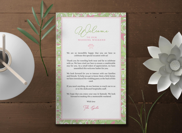 This project includes a set of wedding stationery designed for Harshita and Nathan, created to complement the overall wedding celebration experience. The stationery features a soft and elegant visual style with delicate patterns and pastel tones, blending traditional decorative elements with a clean, modern layout. The designs were created to enhance the guest experience, from the welcome note to the wedding gift box presentation.
